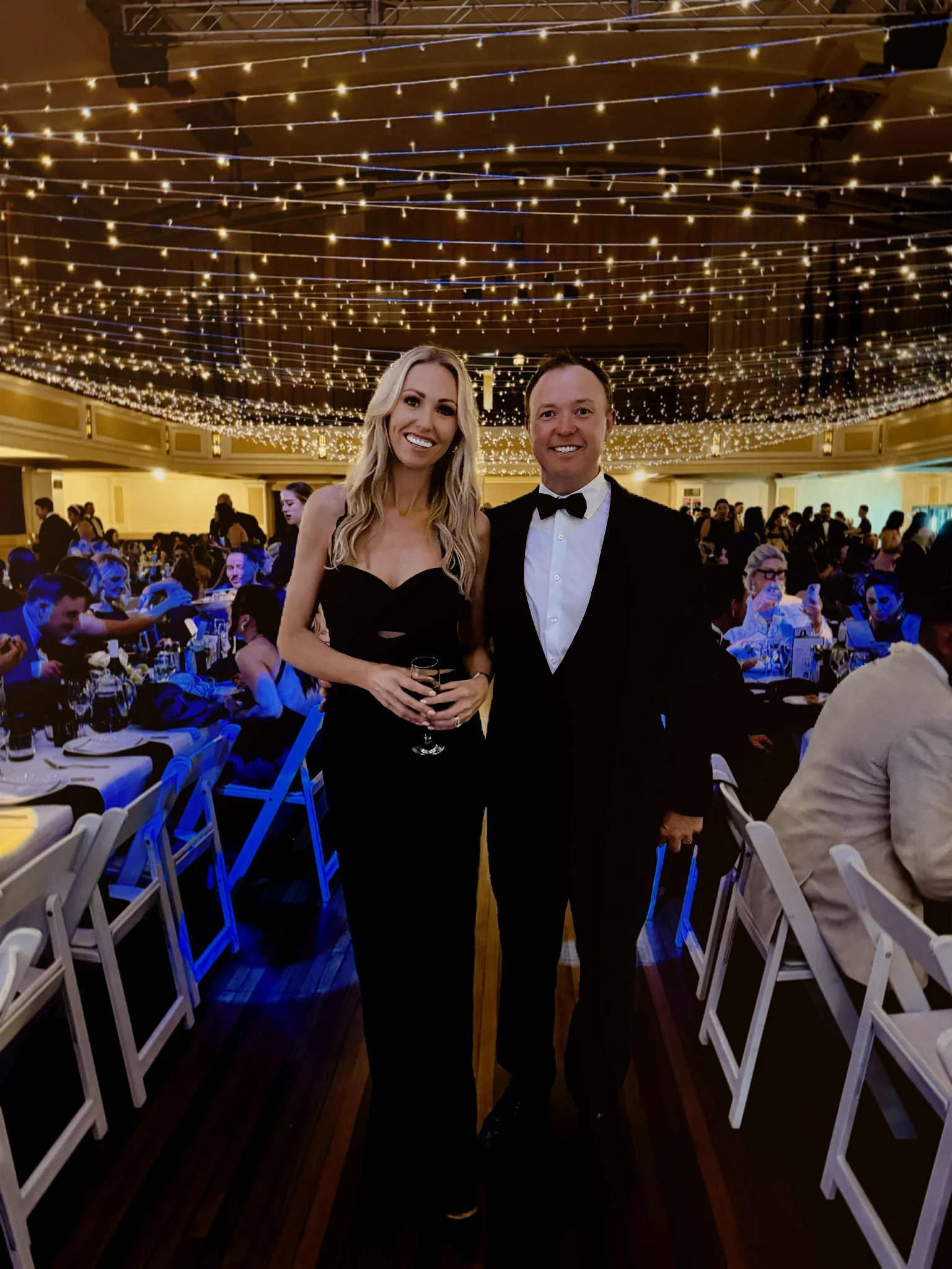 The night before our wedding, Geoff surprised me and my bridesmaids with the reveal: a breathtaking canopy of lights inside the historic Glen Innes Town Hall, our hometown venue. The building was already beautiful, but the golden lights transformed it into something unforgettable. The atmosphere was electric, warm, emotional, and awe-inspiring.